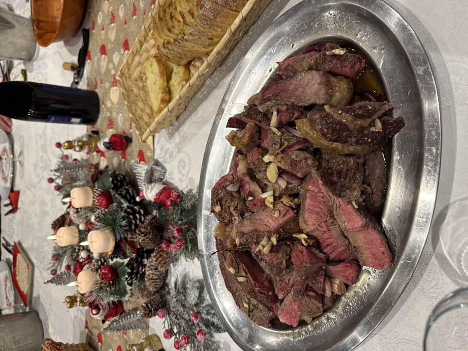 A silver platter holds sliced steak, seasoned with garlic and herbs, amidst a pool of juices. Beside it, a basket overflows with bread slices. A red wine bottle sits near a Christmas centerpiece decorated with pine cones, faux candles, and red berries. The scene unfolds on a patterned tablecloth set on a table.