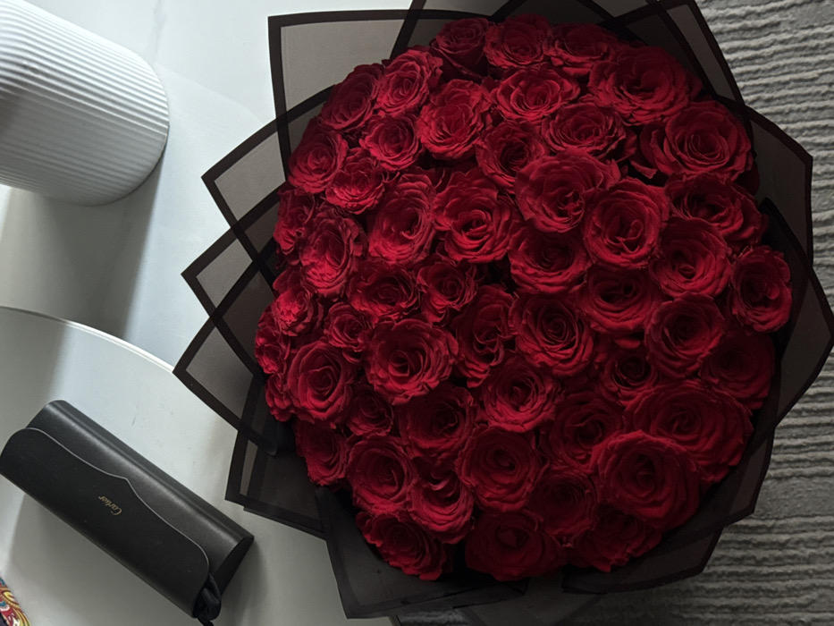 - "A large, compact bouquet of numerous deep red roses is centrally positioned in the image, wrapped in black, translucent paper arranged in a geometric, folded pattern" by FM-8hjXn1, licensed under CC BY 4.0