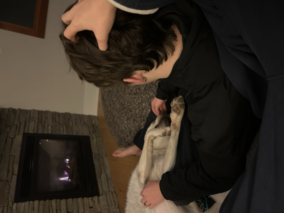- "A person is sitting next to a fireplace, holding a dog on its back" by FM-p02Wp2, licensed under CC BY 4.0