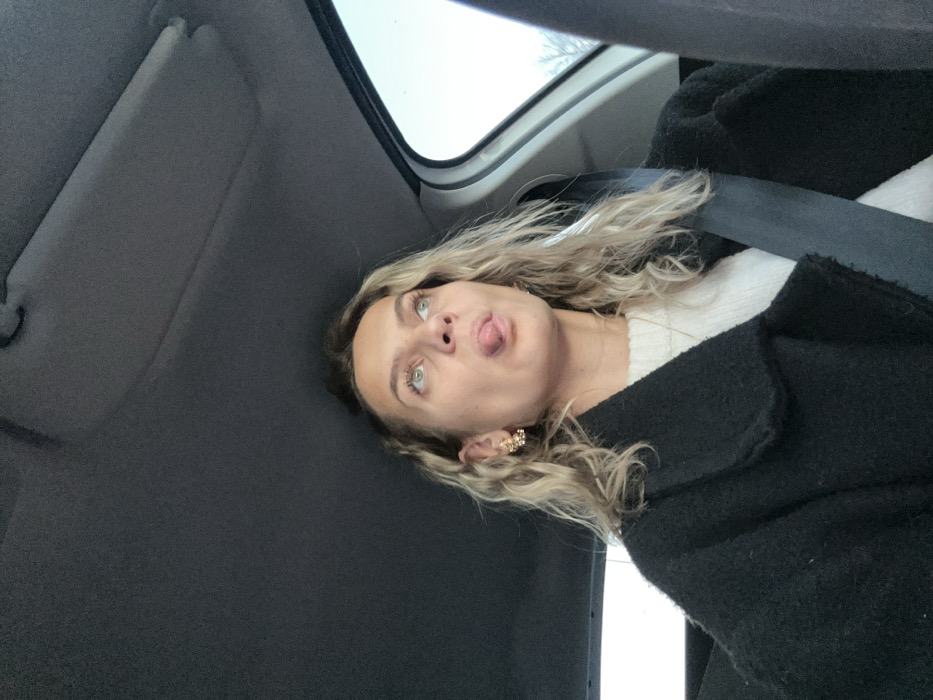 A woman with blonde, curly hair, green eyes, and fair skin is photographed from below while sticking her tongue out. She is wearing a white sweater and a black coat, and a seatbelt is visible across her chest. The background includes the interior of a car, with the ceiling and a window visible. She has a decorative earring. The overall composition is informal and tilted, creating a playful and slightly off-kilter perspective.