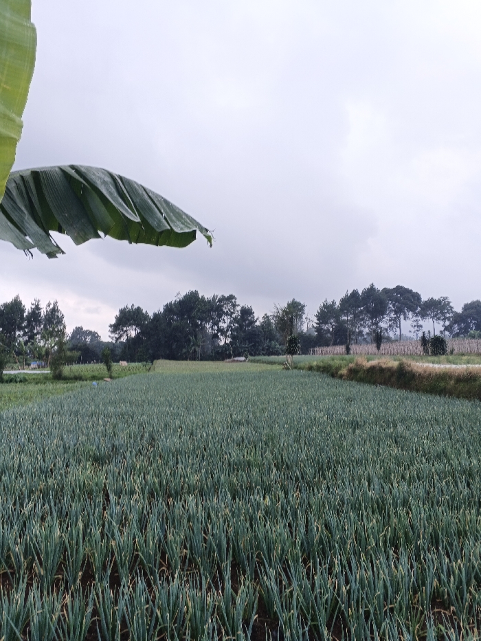 A vast field of green plants, possibly scallions, extends to the horizon. A line of trees separates the field from a gray sky. A single large, vibrant green banana leaf hangs in the upper left corner, partially obscuring the view. The scene is overcast, creating a muted color palette. The field appears lush and well-maintained, indicating agricultural activity.