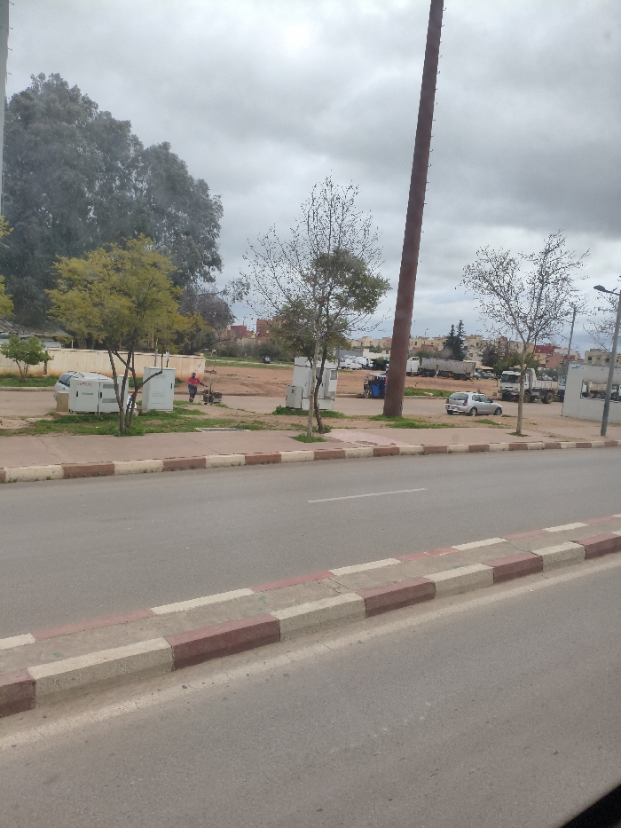 The image depicts an outdoor urban scene in Ouislane, Morocco, under an overcast sky. In the foreground, an asphalt road runs horizontally, bordered by a curb constructed from alternating red and light-colored blocks. Beyond the curb, a narrow paved sidewalk leads to a grassy strip containing several trees, some with green foliage and others with sparse, bare branches. On the left side of the midground, a white sedan is parked, partially obscured by two white utility boxes. A third white utility box is positioned further right. A single individual, dressed in a red shirt and dark trousers, stands behind the leftmost visible utility box, appearing to interact with unseen equipment. A very tall, dark brown pole, possibly a utility or communication tower, rises vertically in the center-right of the midground, extending out of frame at the top. The background features an expansive, unpaved reddish-brown dirt lot where several large trucks and a silver hatchback are parked. Beyond this lot, a residential area is visible, characterized by light-colored buildings and scattered trees. On the far left background, a dense cluster of tall, dark green trees forms a prominent element. A street light pole is partially visible on the far right. The sky is uniformly gray with heavy cloud cover.