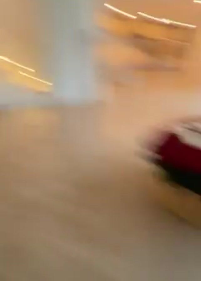 A woman with long brown hair is looking at the camera with her head resting on her hand. She's wearing a black top, and the background shows a bright, modern living space with white walls and a large television. There's a unique light fixture overhead and a glimpse of furniture in the background. The scene then shifts to a large basket filled with red roses, with white roses arranged to form the letter "E." The basket sits in front of a sliding glass door, with a view of an outdoor area beyond. The interior appears to be spacious and brightly lit, with wooden floors and minimalistic decor.