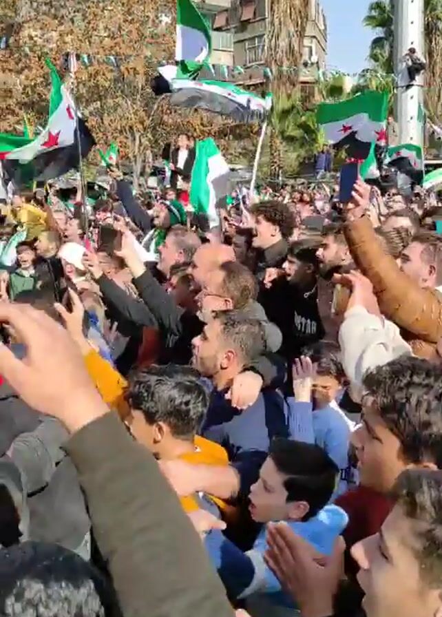large crowd of people in an outdoor setting, holding and waving Syrian flags. Many are cheering and raising their hands in the air. People appear to be embracing and celebrating, as well as filming on their phones. There are buildings, palm trees, and a tall white pole visible in the background. The weather appears sunny.