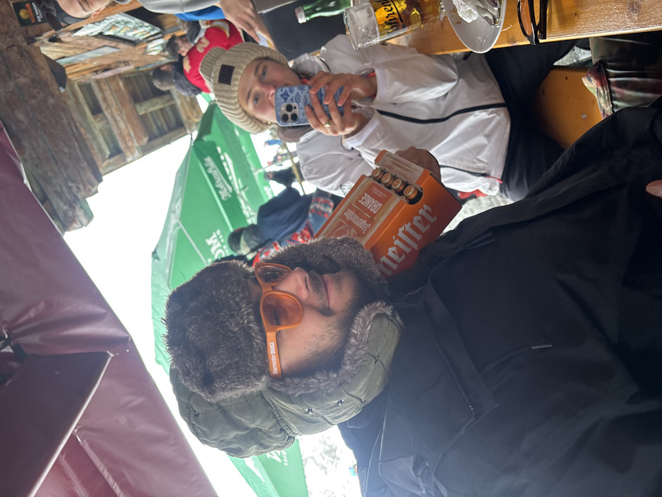 The scene depicts an outdoor or semi-enclosed seating area at what appears to be a ski resort establishment in St