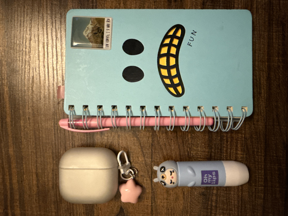 A flat lay composition, located in Voluntari, Romania, displays several personal items on a dark brown wooden surface with visible grain. On the left, an off-white earbud case, consistent with an AirPods case, is positioned horizontally. Attached to its left side is a pink five-pointed star keychain with a silver metal ring and clasp. Below this, a grey, cylindrical cosmetic product container, possibly lip balm, is placed vertically. Its cap is designed as a cartoon animal head with closed eyes, and the lower body features a light purple section with the white text "Oh my lips". To the right, a light blue spiral-bound notebook stands vertically. Its front cover features a stylized face with two black oval eyes and a yellow grid-patterned mouth. Below the mouth, the word "FUN" is printed in black. A rectangular sticker, depicting a snow-capped mountain, is affixed to the upper right corner of the notebook cover. Below the mountain image, Cyrillic text is visible, reading "ГОРЫ КЛИЧУТ, И Я ИДУ". A pink retractable pen with a clip is inserted into the silver spiral binding along the left edge of the notebook. A small pink page marker tab protrudes from the top edge of the notebook.