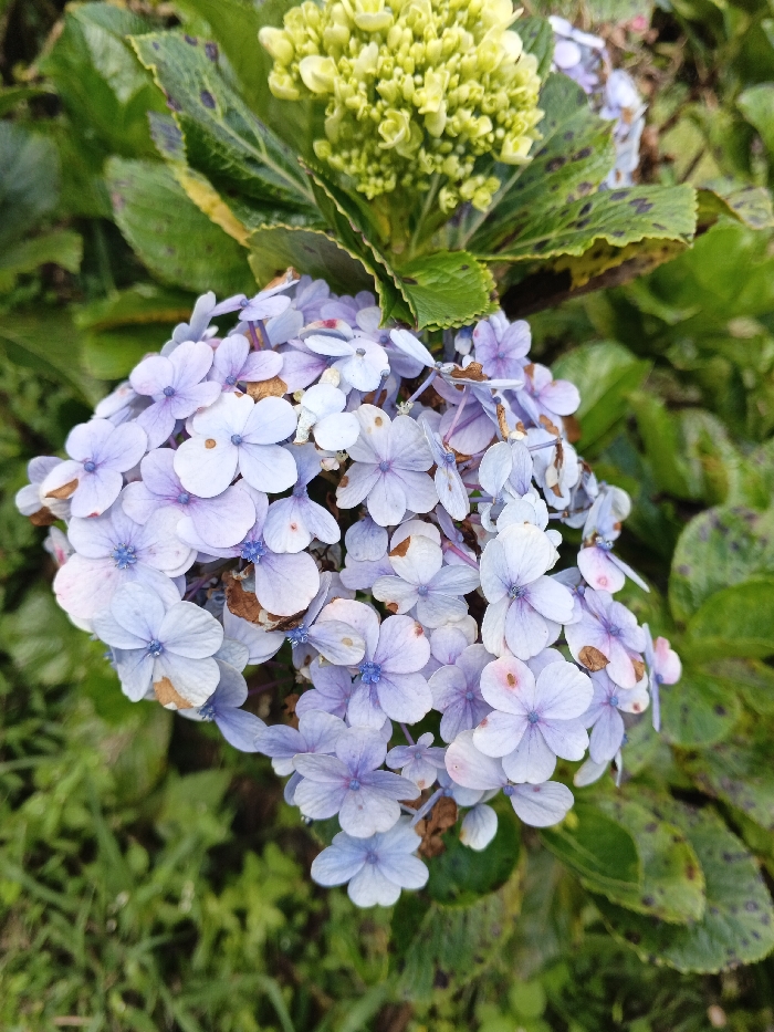 The image presents a close-up, top-down view of a blooming hydrangea plant located in La Castellana, Philippines. The central focus is a spherical cluster of fully opened florets, predominantly light blue to pale lavender in color, with darker blue-purple centers. Individual florets consist of four petals. Multiple florets show brown discoloration and irregular spots on their petals, indicating some age or damage. Above and slightly behind this cluster, a smaller, compact cluster of unopened, greenish-yellow hydrangea buds is visible. The plant exhibits green leaves with visible dark brown or black spots and minor yellowing along their edges and surfaces. The background is composed of blurred green foliage and grass, consistent with an outdoor garden setting. No human subjects, objects other than plant matter, or discernible actions are depicted.