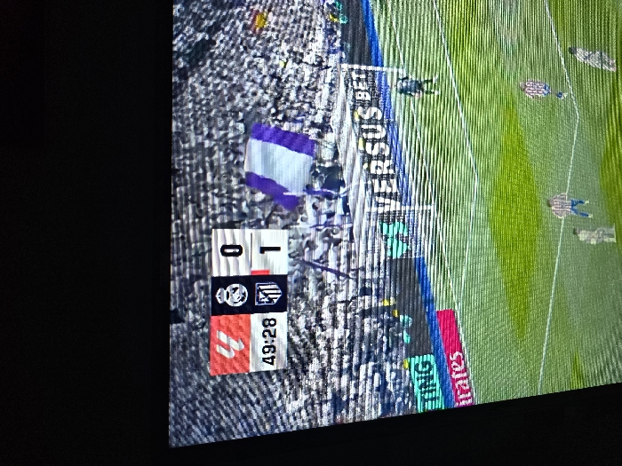 The image depicts a football match in a stadium, located in the city of Giovren, Bulgaria. An on-screen scoreboard in the upper left quadrant displays a red logo with a white '4', followed by the Real Madrid logo with a score of '0'. Below this, the Atlético Madrid logo is shown with a score of '1'. The game time is 49:28. The lower half of the frame reveals a green grass pitch with white markings. Several players are visible on the field, including one in a red and white striped jersey, another in a lighter-colored kit, and additional players in darker uniforms. Behind the pitch, densely packed stadium stands are filled with spectators. Among the crowd, a prominent purple and white striped flag is being held, alongside a partially visible yellow and red flag. Digital advertising boards line the perimeter of the field, displaying text such as "VERSUS BET" and "irates". The image itself shows horizontal line artifacts, indicating it is a photograph of a digital display.