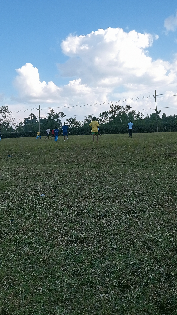 A wide shot of a grassy field under a partly cloudy sky. A group of people are playing on the field, some wearing brightly colored clothing like yellow and blue. Trees line the horizon in the background, with utility poles visible amongst the foliage. The field occupies most of the frame, its texture and color varying due to uneven lighting and different grass types.