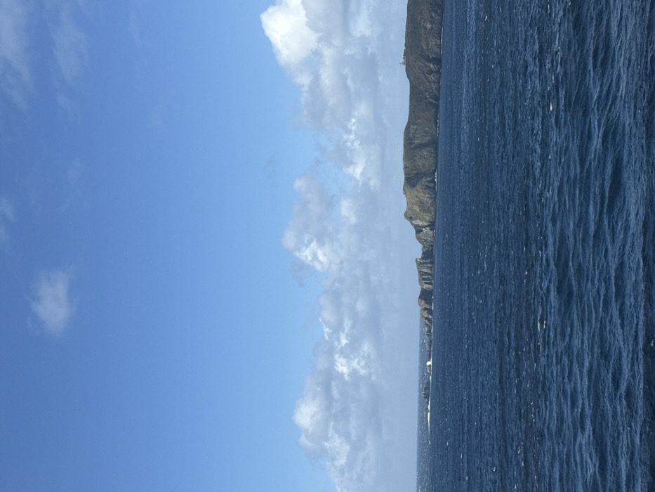 A scenic view portrays a body of water with gentle waves and a rocky coastline. The rocks have a dark, textured appearance, possibly due to vegetation. The sky is predominantly blue, dotted with fluffy white clouds. The photograph is oriented sideways, with the sky on the left and the ocean on the right.