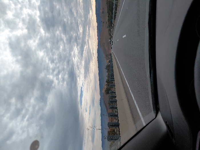 A car travels on a paved road beside a guardrail. Beyond the rail lies a mountainous landscape. A dramatic, cloudy sky covers most of the view. The car's dashboard and part of the steering wheel are visible in the foreground, suggesting the photo was taken from inside the vehicle. The road is marked with a white line along its edge.