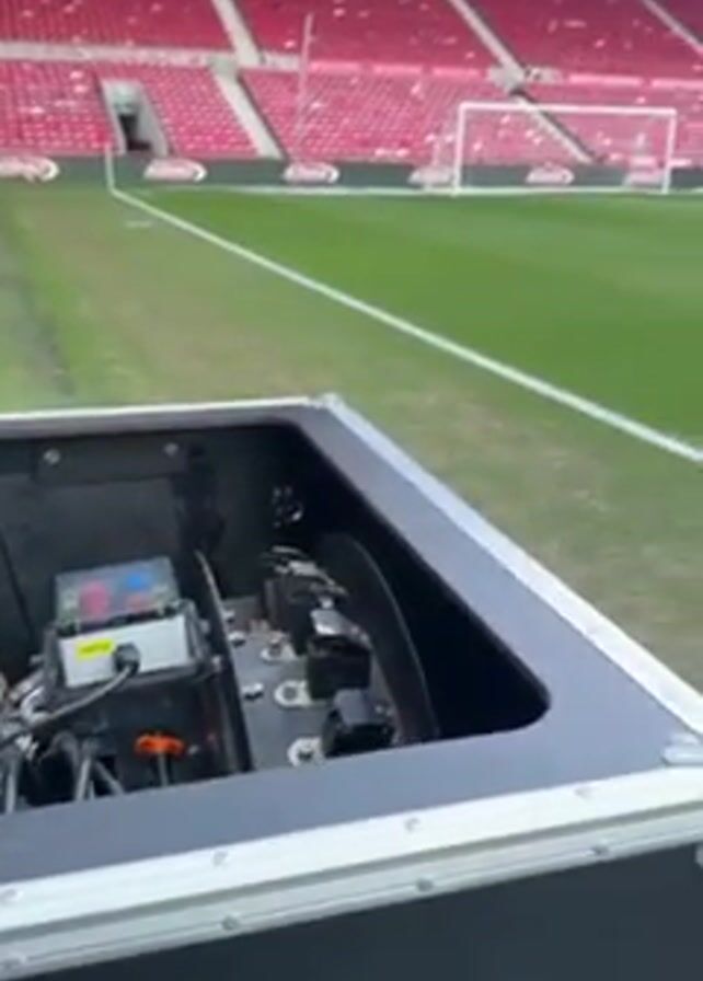 soccer stadium with red seats. The field is green and well-maintained, with white lines marking the boundaries. In the foreground, there's an open case containing equipment with wires and a control panel. The camera pans up to show the stadium stands, the field, and the sky. A bird flies across the sky. The view then moves to focus on the large 'MFC' letters formed by the red seats. The scene appears to be taken during the daytime under partly cloudy skies.