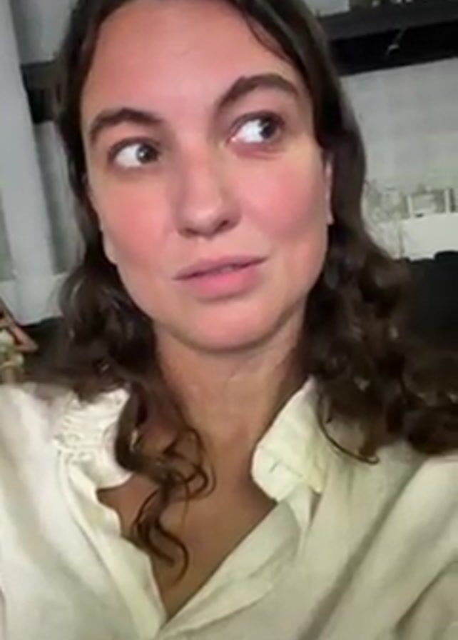 The video opens with a close-up of a young woman with wavy brown hair and wide eyes, wearing a light-colored collared shirt