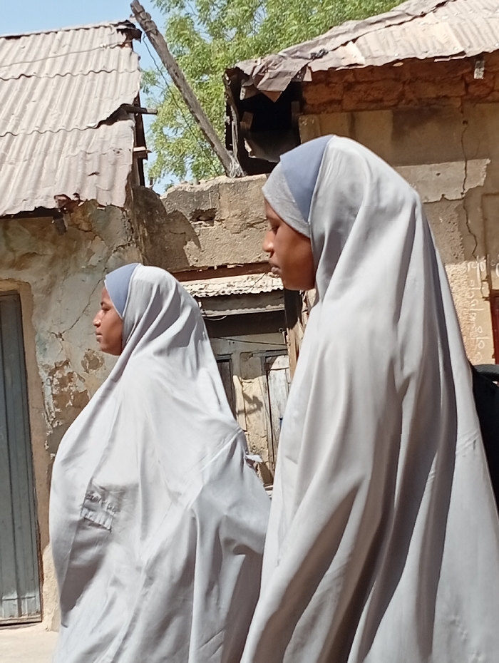 The image displays two individuals in Gwagwarwa, Nigeria, positioned in profile against a backdrop of weathered buildings under a bright sky. Both individuals, appearing to be female, are wearing light grey, full-body coverings and matching head coverings. The person in the foreground (right) is slightly closer and more sharply focused, revealing a dark complexion and neutral facial expression. The second person, positioned behind and to the left, also has a dark complexion and a neutral expression; their garment features a distinct pocket or seam detail on the left side of the torso. They appear to be moving or standing, facing right. The environment consists of dilapidated structures constructed from light-colored, possibly concrete or mud brick, exhibiting visible cracks and wear. The roofs are composed of corrugated metal sheets, some showing signs of damage and rust. A weathered wooden pole ascends vertically between two buildings in the upper background. Green foliage from a tree is visible further behind the structures. The scene is illuminated by bright, clear daylight.