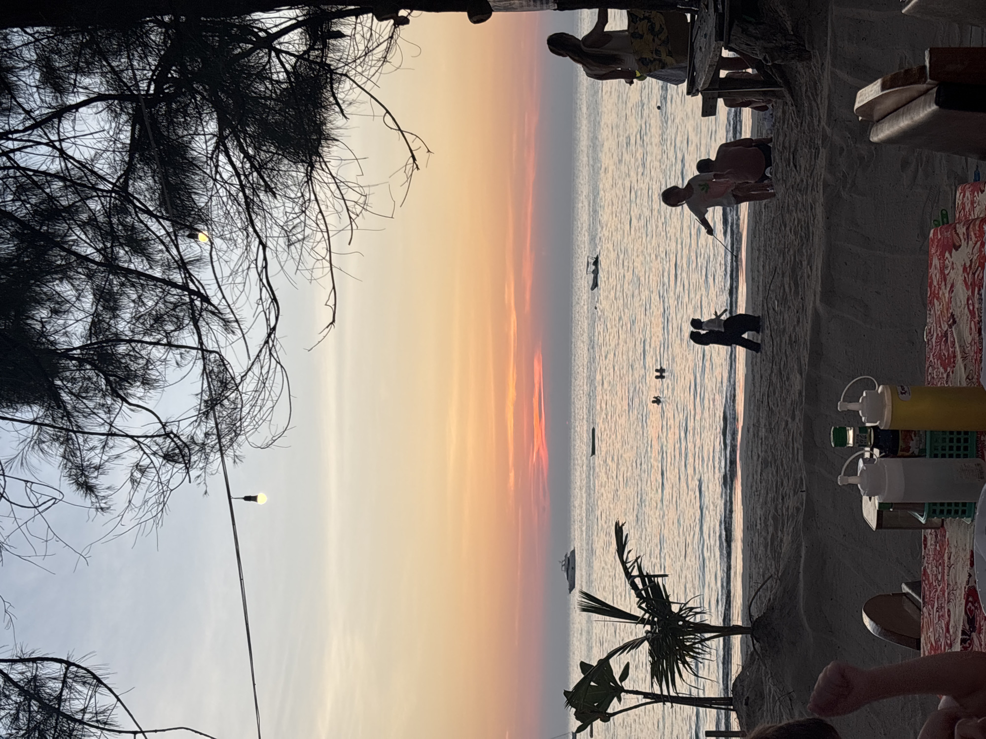 The image depicts a beachfront scene in Kamala, Thailand at sunset. The horizon has orange and pink hues. There are people on the beach and in the water. A couple is walking near the water. A small boat is visible. Some people are sitting at a table on the sand. Sauce bottles are placed on a table with a red patterned tablecloth. Trees frame the view on both sides. A string of lights hangs above.