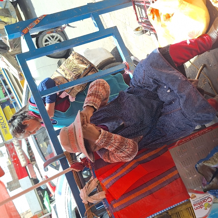 Two women sit within a blue metal frame structure. One wears a blue shirt and red vest. The other wears a hat, patterned shirt, and blue pants. Underneath them are striped red and orange cloths. There is a calendar at the bottom right. A bag rests above them, and another bag is partly visible on the top left. A wheel and other objects can be seen in the background.