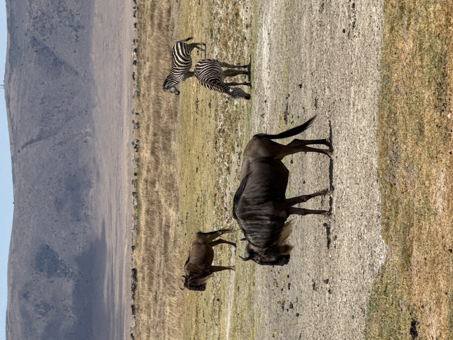 The scene depicts a wide, open savanna landscape under a clear, pale blue sky, located in the general vicinity of Mti Mmoja, Tanzania. In the foreground, the ground is primarily dry, light brown earth interspersed with sparse patches of yellow-brown grass and scattered dark pebbles. Two wildebeest and two zebras are prominent subjects in the midground. To the immediate left, a large, dark-bodied wildebeest stands facing left, exhibiting a light brown beard and mane, with its head slightly lowered. Its thick horns curve outwards. Behind it, further to the left, a second, lighter brown wildebeest stands facing left on a patch of dry grass. To the right of the foreground wildebeest, two zebras are present. The zebra closer to the viewer has its head lowered, grazing on dry grass, facing right. Behind and slightly above it, another zebra stands facing left. Both zebras display distinct black and white striped patterns. In the expansive background, a large herd of numerous wildebeest and zebras is scattered across the vast, dry yellow-brown grassland, appearing smaller due to distance. Beyond the plains, a series of large, undulating dark grey-brown hills or mountains stretch across the horizon, exhibiting natural topographical features under the bright, natural daylight. No human presence, artificial structures, or objects are visible.