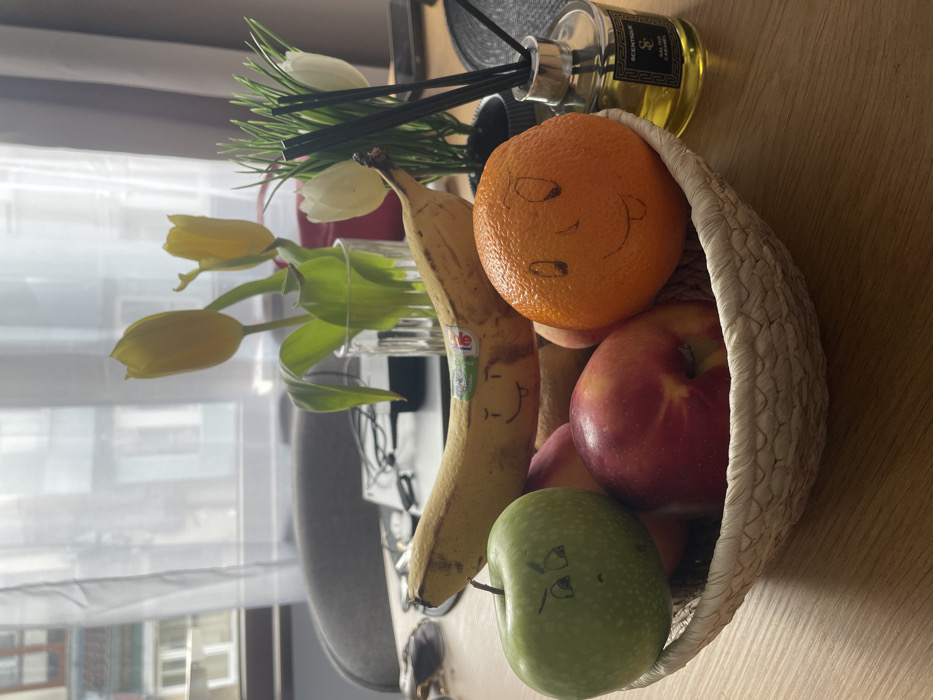 The image captures an indoor scene featuring a collection of objects arranged on a light-colored wooden table. In the foreground, a woven wicker bowl holds various fruits. A green apple, positioned prominently, displays an angry facial expression drawn in black marker. Adjacent to it, an orange also features a hand-drawn face with a playful expression, including a tongue sticking out. A banana, partially resting above other fruits, similarly has a playful face drawn with a tongue extended and bears a Dole sticker. Within the bowl, several red apples or nectarines are also visible. To the right of the fruit bowl, a "SCENTIQUE SALTED CARAMEL" brand diffuser with amber liquid and dark reeds stands on the table. Next to it, a small dark pot contains artificial green grass and two white faux tulips. Further back, a clear glass vase holds three yellow tulips with green stems. On the left side of the table, a pair of sunglasses, a pair of black-rimmed eyeglasses, and dark electronic cables are visible, partially obscuring a dark electronic device. The background reveals a large window draped with sheer white curtains. Through the curtains, a view of multi-story residential buildings with light-colored facades and numerous windows is discernable, indicating an urban setting. This scene is located within a residence in the city of Varna, Bulgaria.