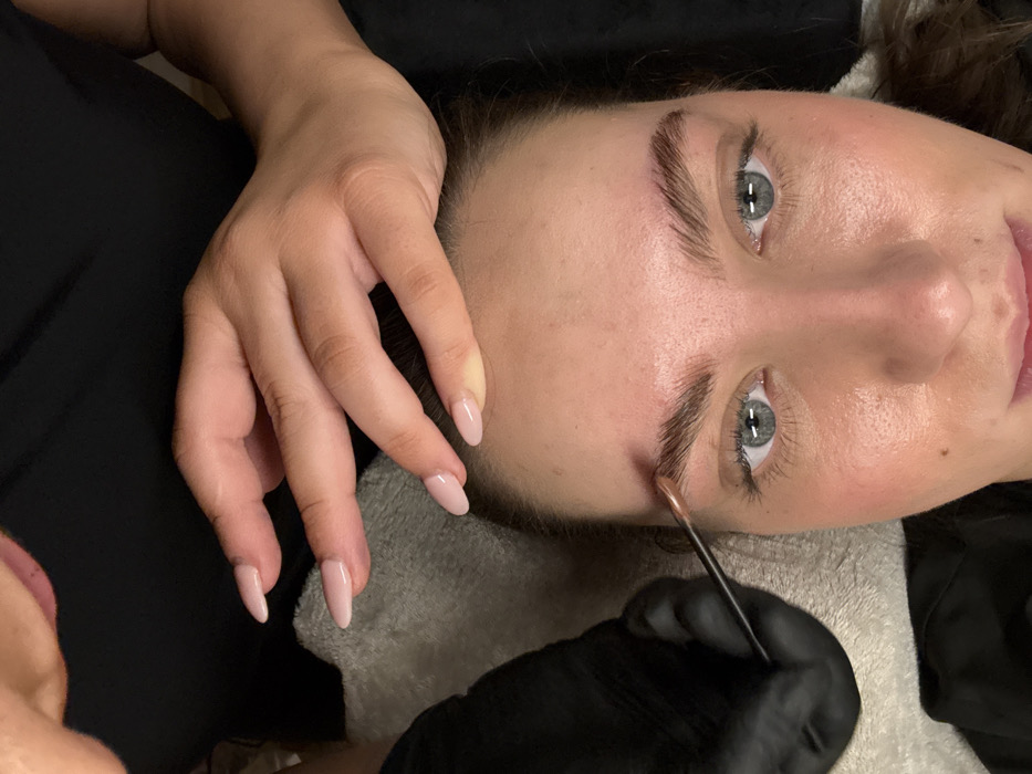 A woman lies on her back with a technician shaping her eyebrows. The technician wears black gloves and uses a tool to apply a product to the client's right eyebrow. The client's hand, with long, manicured nails, is near her forehead. Her face is pale, with defined eyebrows and blue eyes. A towel is under her head.