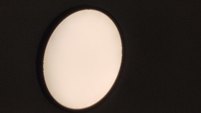 An oval-shaped light fixture is mounted on a dark, textured surface. The light emitted from the fixture is bright and diffused, creating a stark contrast against the surrounding darkness. The fixture's edge is defined by a subtle, textured border. The dark surface, likely a wall or ceiling, exhibits a grainy texture.