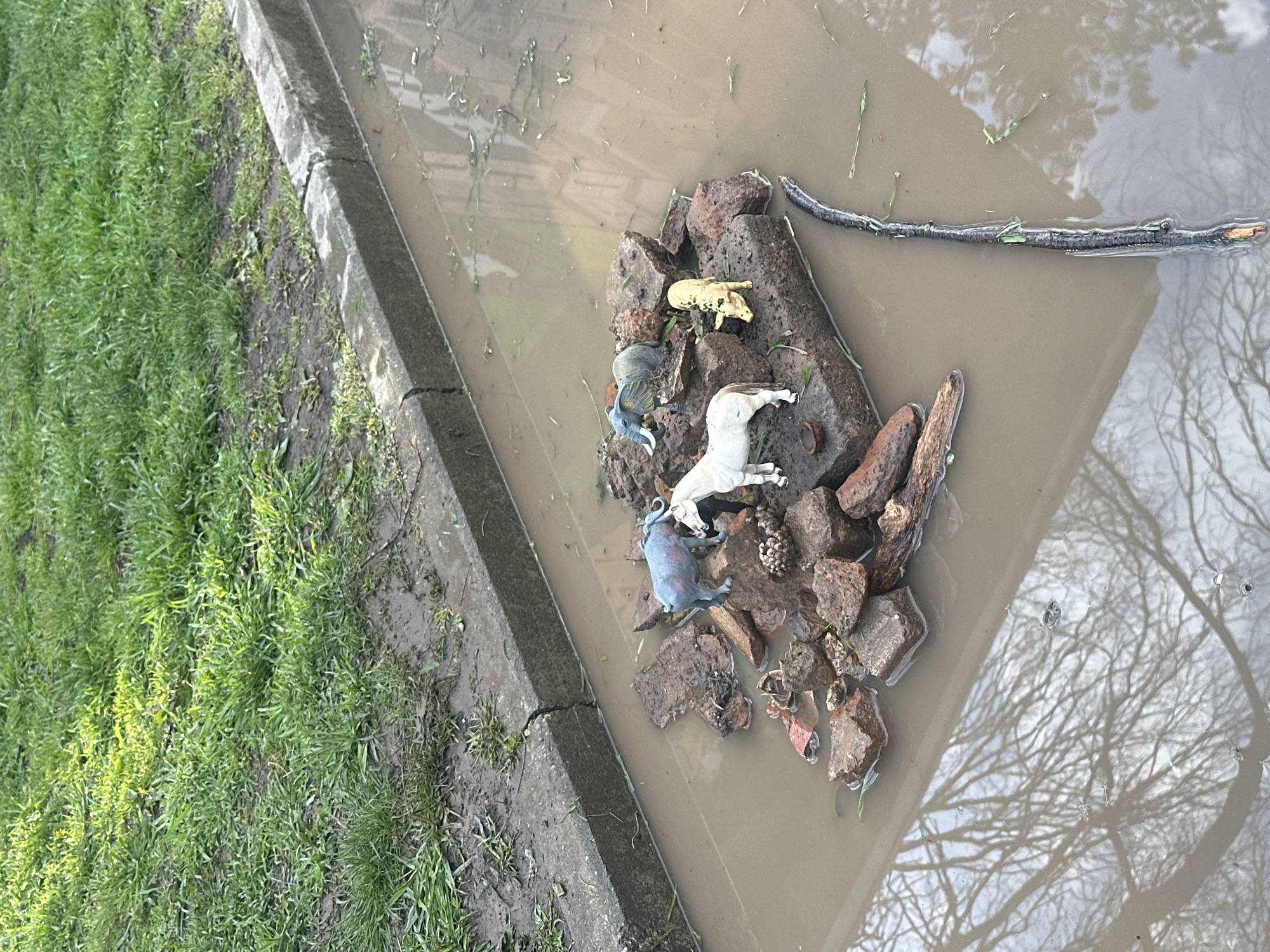 A ground-level shot depicts a flooded gutter adjacent to a grassy area. The gutter contains several plastic toy animals (elephant, pig, horse) atop a pile of brick fragments and rocks. A tree branch floats in the water. A tree's reflection is visible in the murky water. The exact location in the city of Dobrich, Bulgaria cannot be identified from the image.