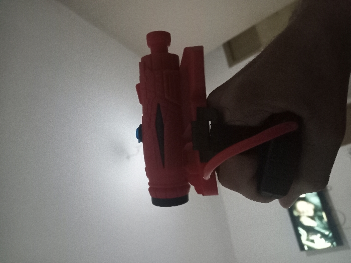 A hand grips a red toy blaster. The blaster has a black rectangular attachment on its handle with a red curve connecting to the blaster. The hand is holding the blaster up, angled slightly towards the viewer. The background is blurry, showing a wall and a glimpse of what appears to be a screen.