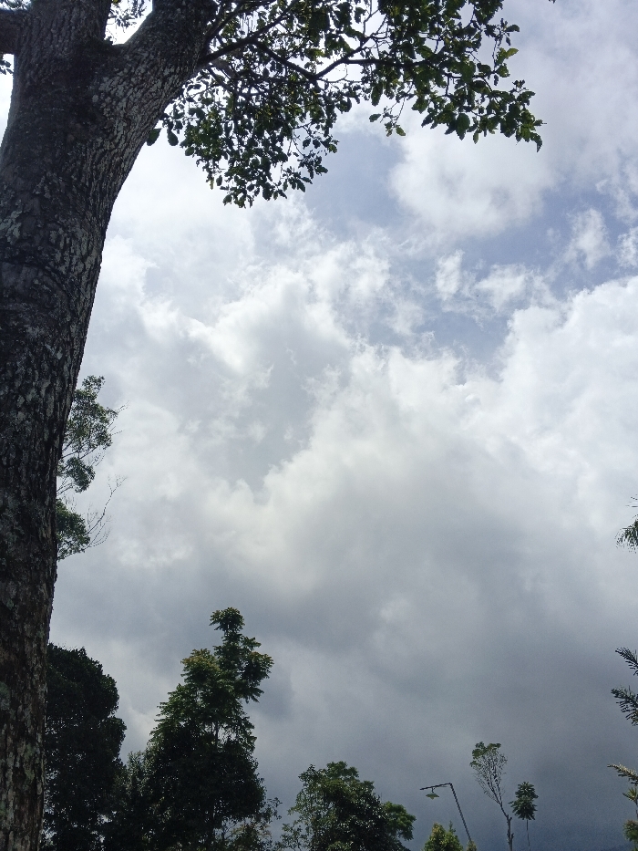 The image displays an upward-angled view of a natural environment within Palayan City, Philippines, dominated by sky and trees. A large tree trunk, characterized by textured dark bark, extends vertically along the entire left side of the frame. Its upper branches, adorned with green foliage, protrude into the upper left quadrant. The majority of the central and right portions of the scene consist of a sky filled with a dense accumulation of white and gray cumulus clouds, interspersed with limited sections of light blue sky. Below the cloud line, in the lower half of the frame, multiple smaller trees with green canopies are visible. A dark street light fixture, comprising a pole and a downward-angled lamp, is discernible in the lower right, partially obscured by foreground foliage. No people, discernible actions, or interactions are present in the static scene.