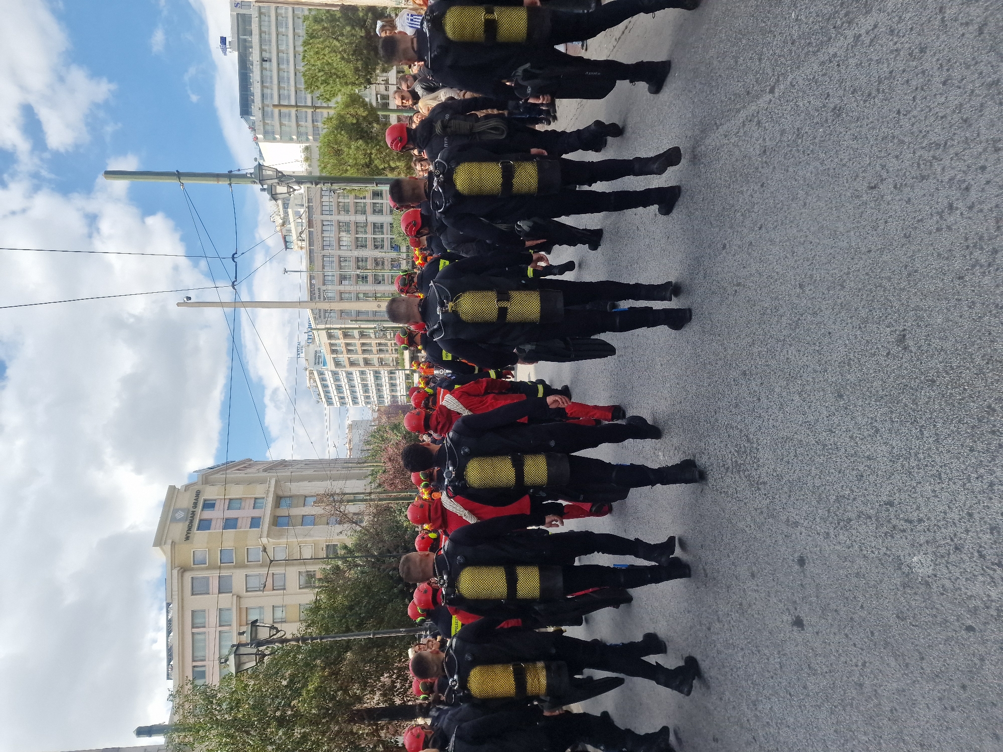 The image presents an urban street scene in Athens, Greece, focused on a procession of emergency services personnel. The backdrop features multi-story buildings, including the prominent "Wyndham Grand" hotel and the "Crystal CityView" hotel, confirming the location near Karaiskaki Square. Approximately twenty individuals are depicted walking away from the viewer along an asphalt road. The primary subjects are a group of male individuals wearing black wetsuit-like uniforms, black boots, and large, bright yellow scuba air tanks strapped to their backs. Some also wear red helmets. Interspersed among them are individuals dressed in red firefighter uniforms with reflective yellow stripes, one of which clearly displays "ΠΥΡΟΣΒΕΣΤΙΚΟ" (Fire Department) in Greek, indicating their affiliation with the Hellenic Fire Service, likely a specialized diving or disaster response unit. One individual on the left carries a pair of black dive fins. On both sides of the street, sidewalks are visible, populated by a scattered group of bystanders observing the procession. The urban environment includes street lighting poles, utility poles with overhead wires, and green trees lining the thoroughfare. The sky above is partly cloudy.