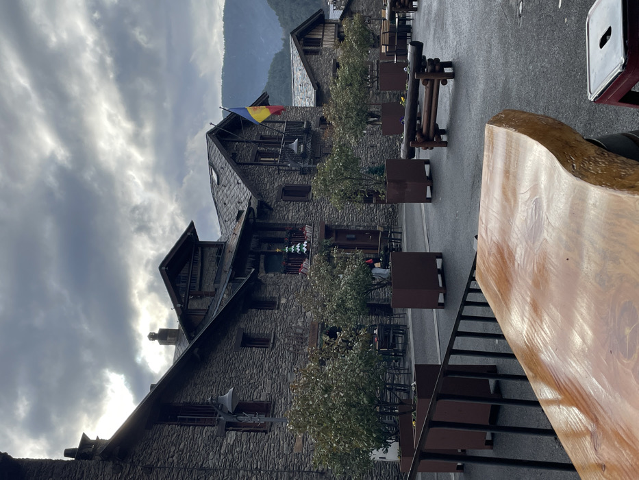 The image depicts an outdoor scene in the city of Ordino, Andorra, under an overcast sky. The foreground features a large, irregularly shaped wooden tabletop with a live edge, showcasing prominent wood grain and a glossy finish, positioned in the lower left and center. A black metal railing with vertical bars diagonally crosses the mid-ground, separating the immediate foreground from a paved public area. To the right of the wooden table, the top of a red-based stool with a metal seat is partially visible. The paved area, appearing damp, stretches towards a row of traditional multi-story buildings constructed from dark grey stone with dark slate roofs. Numerous windows and balconies are visible on these structures. On a central building's second-story balcony, a green artificial Christmas tree adorned with white lights and several wrapped gift boxes with red bows are displayed. The flag of Andorra, featuring vertical stripes of yellow, blue, and red, flies from a balcony on an adjacent building to the right. Scattered across the paved area are several dark brown, rectangular planters containing small, leafy green trees or shrubs. Outdoor cafe seating, comprising dark tables and chairs, is arranged near the buildings. A distinct rustic bench, constructed from multiple logs, is situated on the paved ground to the right, possibly holding small plants in a trough. In the distant background, forested mountain slopes are visible beneath the uniformly grey, cloudy sky. No individuals are clearly visible within the scene.