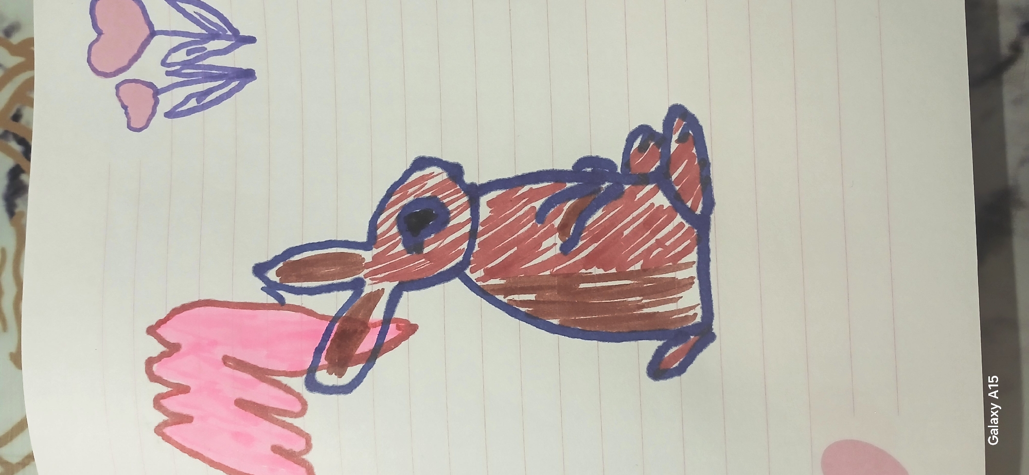 - "A drawing on lined paper depicts a brown dragon with blue outlines breathing pink fire" by FM-VUq8y1, licensed under CC BY 4.0