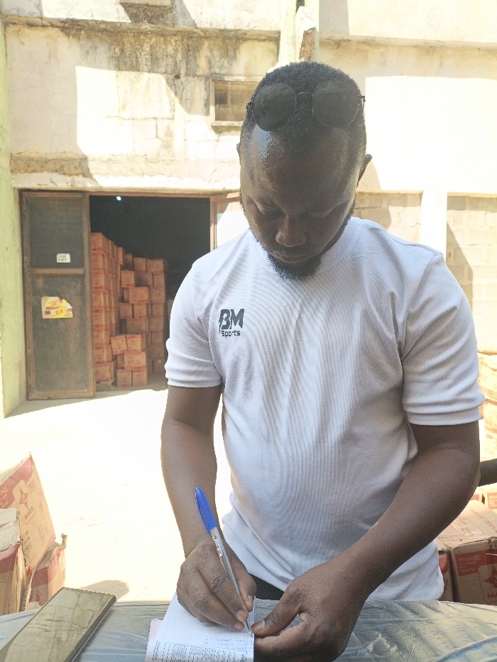 The scene is set in Fagge A, Nigeria, outdoors in what appears to be a commercial or storage area. A male individual, appearing to be an adult, is depicted from the waist up, looking down as he writes. He has dark, short hair, a beard, and sunglasses are perched on top of his head. He wears a white short-sleeved polo shirt with a dark "BM Sports" logo on the left chest. His right hand holds a blue ballpoint pen, actively writing on a small piece of paper or notebook resting on a surface in front of him. A dark, reflective rectangular object, possibly a mobile device, lies on the surface to his left. Behind him and to his left, numerous cardboard boxes are stacked, with several visible outside and a larger stack extending into an open doorway. Some of these boxes bear a red "MAGGI" brand logo. The background features a light-colored, weathered building with a visible window and open doorway. The lighting is bright and consistent with daylight.