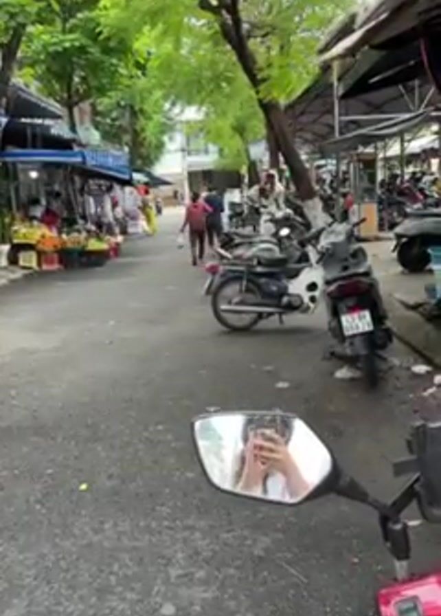 A person is on a red scooter parked in a market street with numerous parked motorbikes. There are various vendors with stands on the left side of the road, selling fruits and other goods, and people are walking around and browsing. Trees line the road, and structures provide shade for the parked motorbikes.