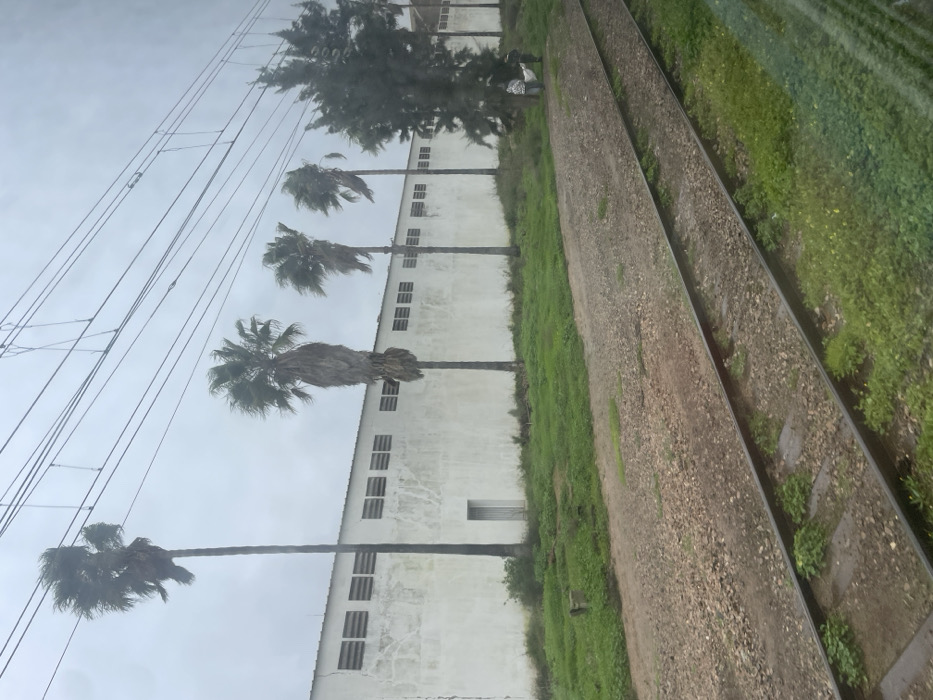 A row of palm trees lines a white building with evenly spaced, rectangular windows. Overhead power lines stretch across the sky. A train track runs parallel to the building, bordered by gravel and vegetation. The scene appears to be captured from a moving train or vehicle, as the perspective is angled and slightly blurred. The sky is overcast, suggesting a cloudy day.