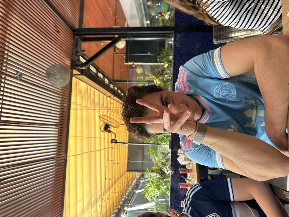 A man in a light blue Miami soccer jersey holds up a peace sign at an outdoor restaurant