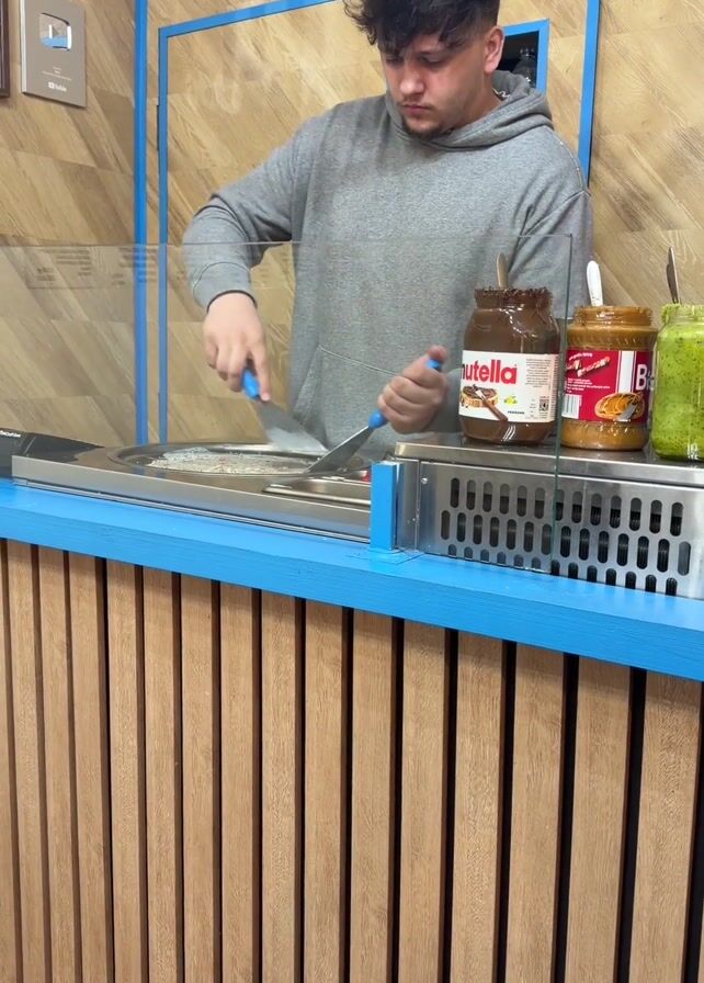 A young man wearing a gray hoodie stands behind a counter, preparing a frozen treat. He wields two metal spatulas to chop and mix ingredients on a flat, chilled surface. Jars of Nutella, Biscoff spread, and green kiwi filling sit on the counter behind him. The counter has a blue top and a vertical wooden slat front. Behind him is a wall with a YouTube silver play button hanging on it. The counter also has a glass shield.