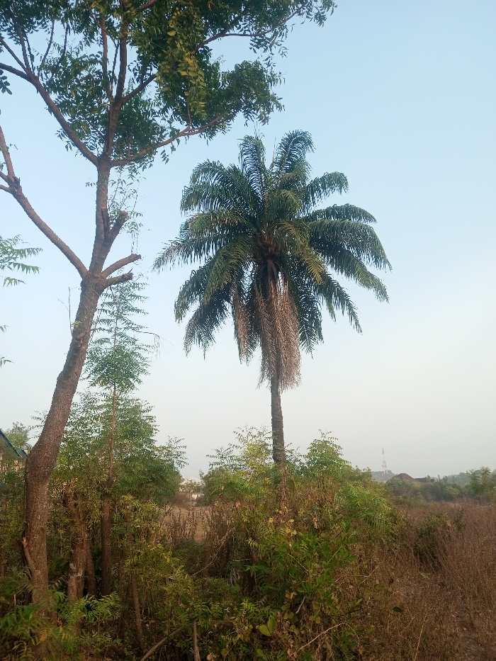 The image displays an outdoor scene in Okeni, Nigeria, under a clear, pale blue sky. In the mid-right, a tall palm tree stands prominently, featuring green fronds at its crown and numerous dried, brown fronds hanging below. To the left, a deciduous tree with a visible multi-branched trunk and scattered green foliage occupies the foreground. The lower half of the frame is dominated by dense, uncultivated vegetation comprising various green shrubs and dried, brown grasses. In the far distance, on the right horizon, a red and white lattice communication tower is visible, with faint building structures appearing to its left. No human subjects or specific actions are present in the scene.