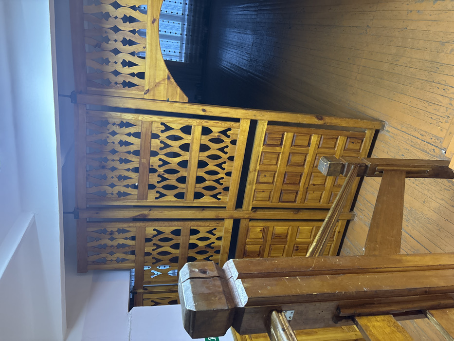 The scene depicts an interior view within a building in Bayronovka, Russia. In the immediate foreground on the left, a light-to-medium brown wooden staircase balustrade with a prominent square newel post is visible, descending towards the lower right. Across the midground, a series of large, light-brown wooden partitions function as screens or sliding doors. These partitions feature two upper tiers of intricate, openwork latticework with stylized organic patterns, and a lower tier composed of numerous small, square raised panels. They are suspended from a dark overhead track mounted to a plain white ceiling. An arched opening is present on the rightmost partition, leading into a darker recessed hallway or room. At the far end of this secondary space, a window with light-colored, possibly sheer, curtains is partially visible. The floor throughout the visible area consists of wide wooden planks, painted a worn orange-brown color, showing extensive scuffing and areas of chipped paint. No individuals or observable actions are present.