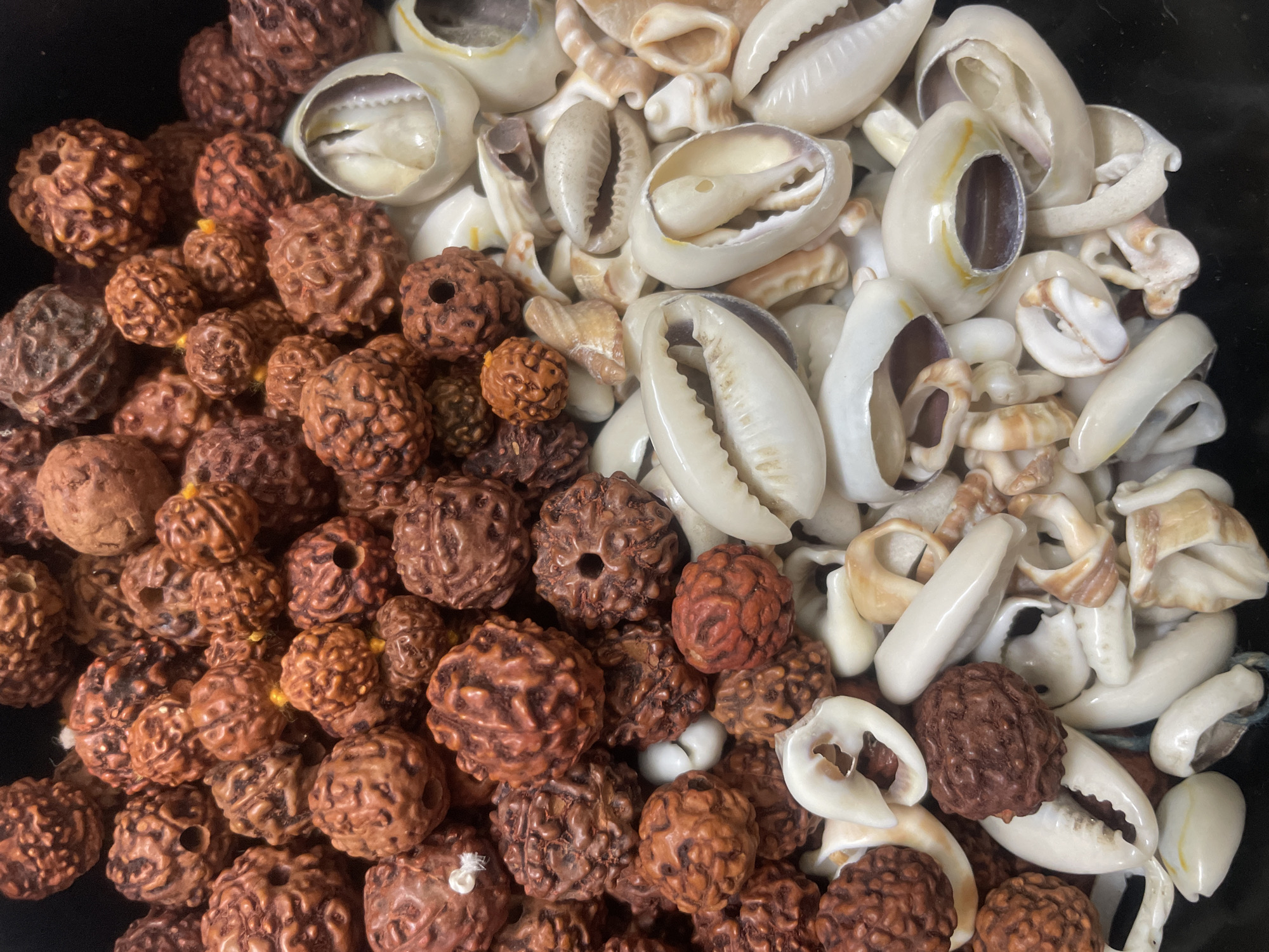 collection of rudraksha beads and cowrie shells in a container