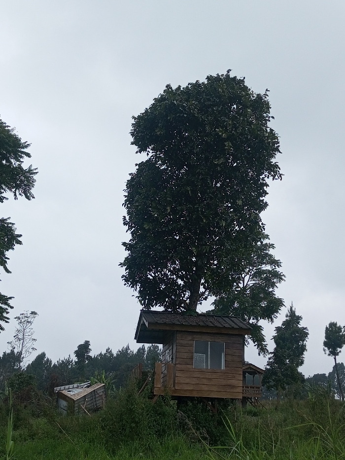 A wooden treehouse stands nestled under the dense canopy of a tall tree. The structure, featuring a window and angled roof, appears elevated off the ground. Overcast skies dominate the background, with distant trees lining the horizon. Green foliage and tall grass fill the foreground, creating a natural, overgrown setting. A small, dilapidated shed sits to the left of the treehouse.