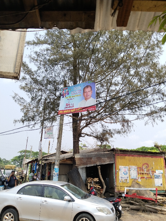The scene is located in Pangasia, Bangladesh, at coordinates 22.705 latitude and 90.565 longitude. A large billboard featuring a male politician, identified as "Sheikh Hasina", is mounted on a wooden pole anchored to a large tree in the foreground. The billboard is decorated with festive, colorful flowers and bears Bengali text. It hangs against a backdrop of a cloudy sky. The tree is surrounded by a collection of small shops and a single car is parked in front of one of the shops. Several people are in the scene, including a man on a motorbike and a man on foot wearing a blue shirt and a black jacket. The buildings are constructed of corrugated metal and are partially obscured by the tree. The ground is composed of dirt, debris, and scattered sticks.