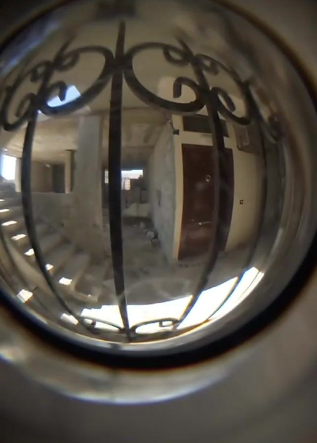 The view is through a peephole, showing an interior space under construction