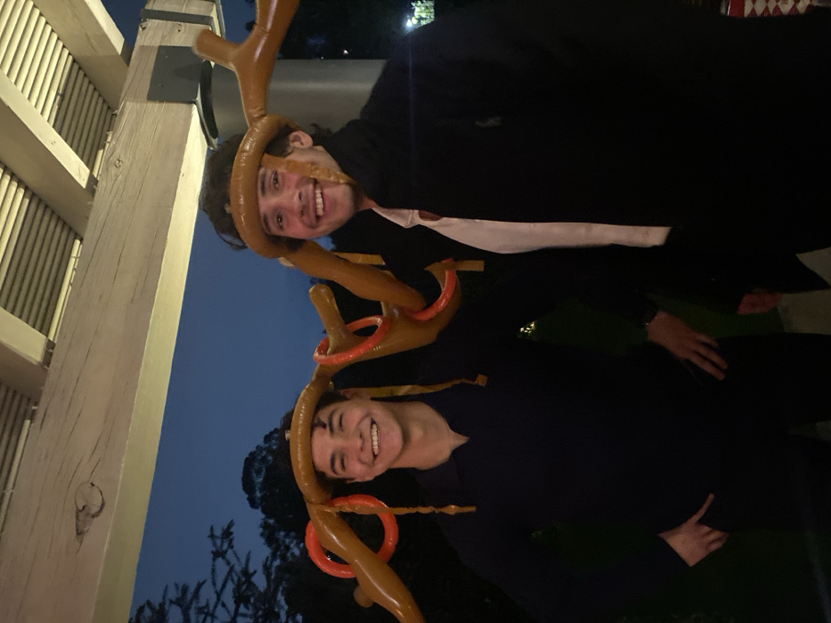 Two smiling young men wear reindeer antler ring toss games on their heads. The top man wears a white shirt and a dark jacket, while the bottom man is in a dark shirt. They stand near a wooden structure with lights. The background is dark with trees and a deep blue sky.