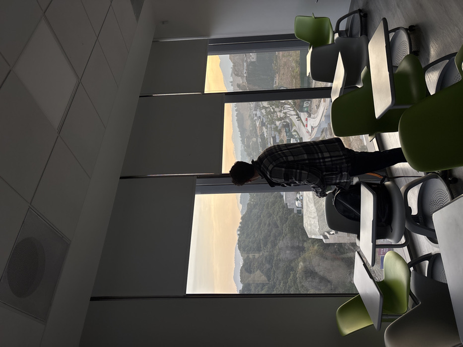 A person in a checkered shirt looks out of a tall window. Roller blinds partially cover the panes. Outside, a view extends over a landscape of hills and a distant town under a bright, soft light. The room contains multiple rows of school desks with green chairs and attached writing surfaces, arranged diagonally. A ceiling panel is visible at the top-left with a circular vent.