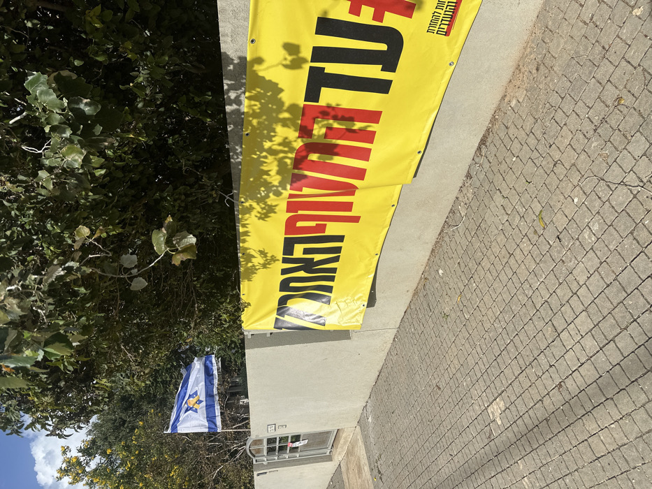 The image displays an outdoor scene in Beit Yitshak Sha'ar Hefer, Israel, under bright daylight. A light-grey concrete wall runs parallel to a paved sidewalk composed of grey rectangular pavers. Affixed to the right section of the wall is a large yellow banner. The banner features Hebrew text in red and black, including the phrase "עַד הַנִצָּחוֹן הַמְּלֵא" (Until complete victory) and a smaller logo at the bottom right. Grommets are visible along the banner's edges, securing it to the wall. To the left, an Israeli flag is mounted on a pole extending from a shorter portion of the wall. The flag is blue and white with a Star of David, upon which a golden, stylized emblem is centered. Further left, a light-colored metal gate with a mesh pattern is recessed into the wall. A white sign with black numbers "274" is present on the wall adjacent to the gate, which also features a red and white sticker. Green foliage from trees and bushes is visible behind and above the wall, casting shadows onto the wall and banner. No individuals are present in the frame.