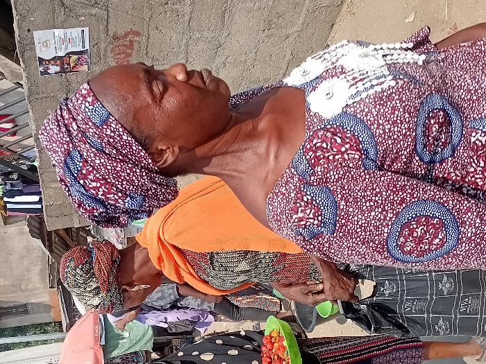 An elderly woman, with a patterned headscarf and orange shawl, sits outdoors. She wears a large patterned dress with a white lace collar and sits beside a black sheet. Her face is lined and weary. Nearby are items for sale, including tomatoes in a green container. A building with a posted flyer stands in the background, alongside a pile of clothes. The overall impression is of a scene of poverty and survival.