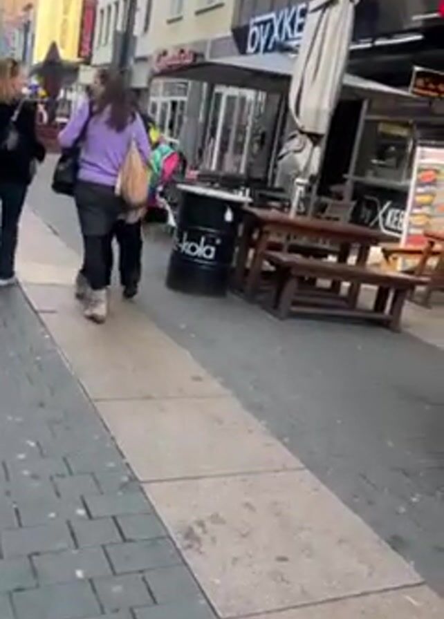 The video captures a street scene in a European city. The camera moves slightly as it follows two women walking away from the viewer along a paved sidewalk. The woman on the left is wearing a black jacket and jeans, while the one on the right has on a purple sweater and a black skirt. The camera focuses on the right side of the street, showcasing a restaurant named "by KEBAB" with outdoor seating. The seating area includes tables and chairs, protected by umbrellas. A black metal barrel with "Hitz-Kola" printed on it stands near the tables. The street is lined with buildings in various shades of yellow and white. Other pedestrians can be seen in the distance.