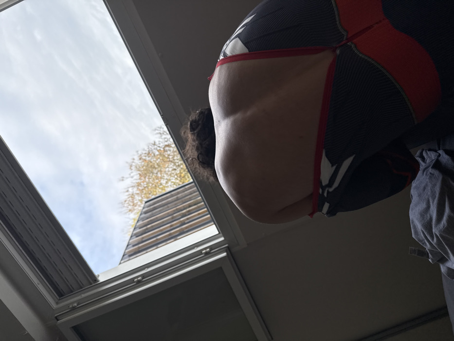 A low-angle interior photograph captures the upper back of an individual with dark, curly hair, viewed from behind, as they face an open window. The subject's light-toned skin on the upper back and shoulders is exposed, with a dark garment featuring red trim and white/grey geometric patterns partially lowered to the mid-back. A crumpled grey textile item is visible in the bottom-left foreground. The open white-framed window, likely a skylight, dominates the upper frame, revealing an exterior scene under a cloudy sky. Through the window, a building section with vertical wooden or slatted panels is visible, partially obscured by trees exhibiting yellow and orange autumn foliage. The scene is located in the city of Rennes, France.