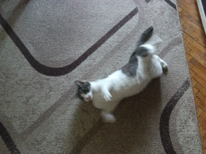 - "An indoor scene in Pomorie, Bulgaria, depicts a white and grey domestic cat lying on its back on a light brown carpet" by FM-XAx8m2, licensed under CC BY 4.0