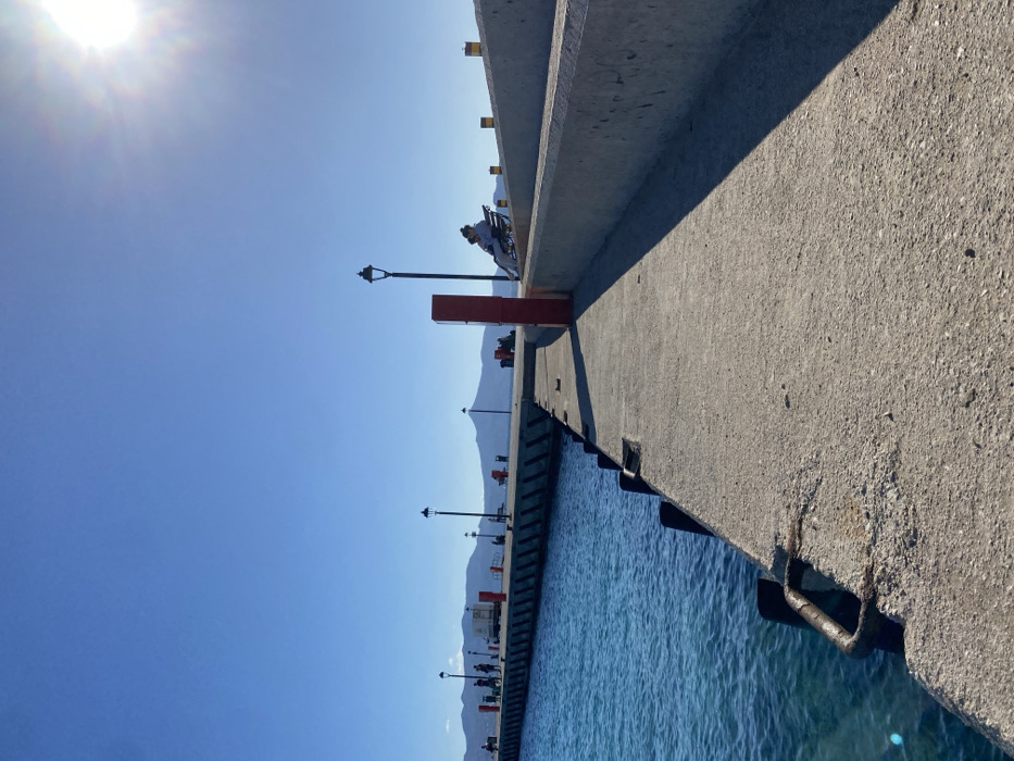 The image depicts a concrete pier on a bright, sunny day in Skala, Greece
