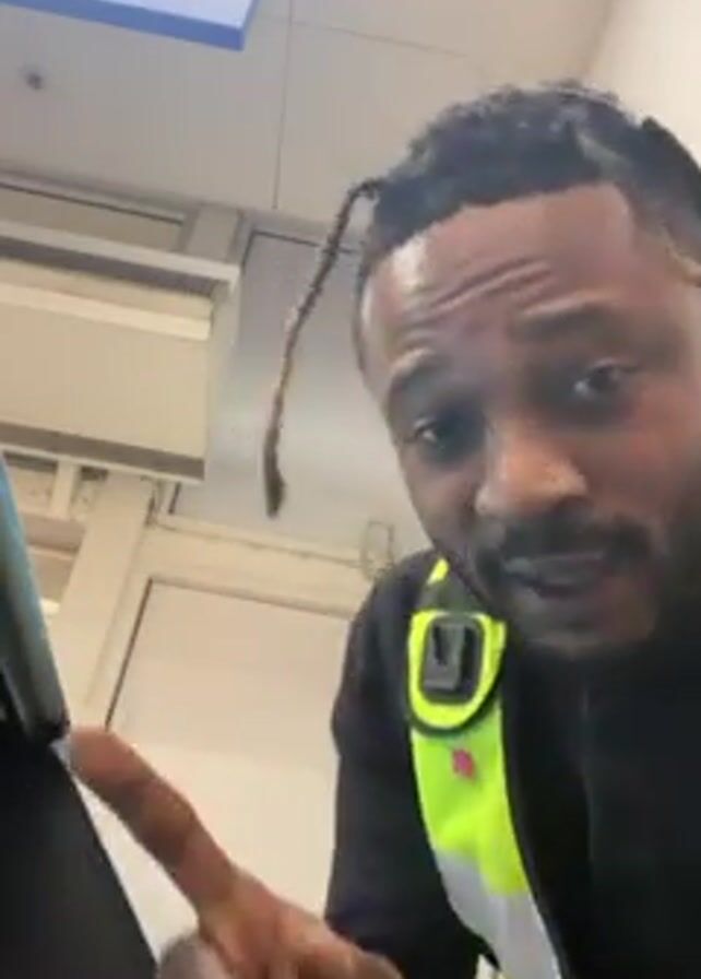 A person wearing a black shirt, yellow security vest, headphones and a nose ring looks into the camera and makes a face. The person is indoors, in what appears to be an office space with a white ceiling and white walls. The person has braids. They put their fingers to their forehead, widen their eyes and look at the camera.